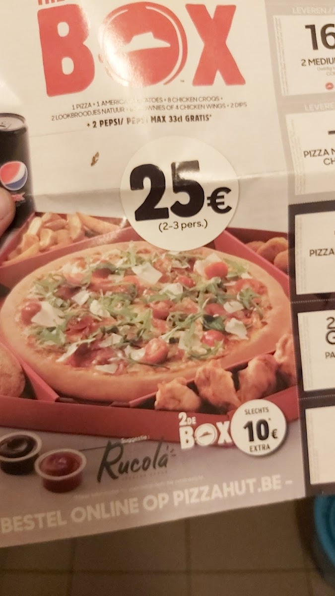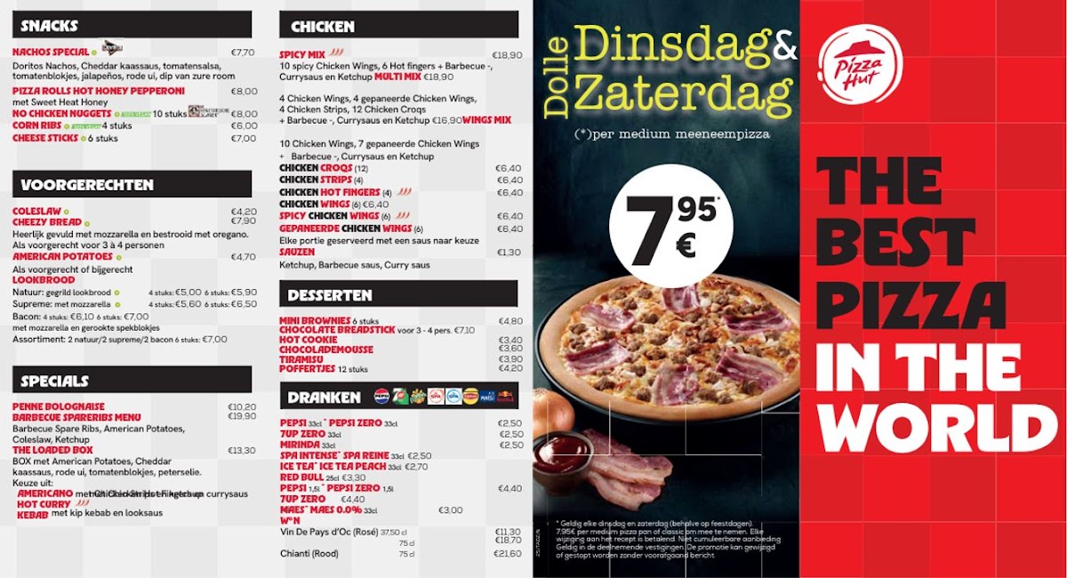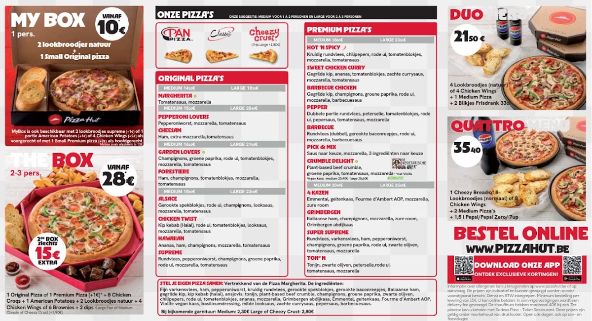 The menu at Pizza Hut Delivery in Waregem offers a wide range of delicious options, perfect for any craving. For starters, you can enjoy the Nachos Special or indulge in the variety of Lookbrood Assortiment, with options like Lookbrood Bacon 6 and Lookbrood Natuur 6. The chicken selection features favorites such as the Multi Mix, Chicken Hot Fingers, and Chicken Wings, ideal for those looking for a savory, crispy bite. When it comes to pizza, the menu includes classic choices like Margherita, Cheesam, and more adventurous options like Forestière and Hot 'N Spicy. For those who prefer a BBQ flavor, the Barbecue Chicken pizza is a great pick. For dessert, treat yourself to a sweet finish with a rich Chocolade Mousse or a classic Tiramisu. The menu also features combination items such as The Box, Menu voor 2, and Menu voor 4, making it convenient for sharing or enjoying a meal with loved ones. Overall, the variety of dishes offers something for everyone, with delicious options across all courses.