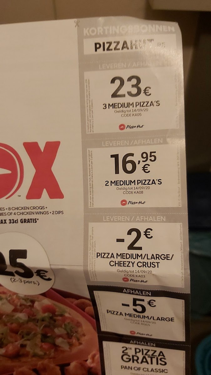 1 large PAN pizza (of 1 medium Classic of 1 Cheezy Crust (+1,90euro), 2 lookbrood natuur, 1 portie American Potatoes, 8 Chicken Croqs, 4 Chicken Wings of Mini-Brownies, 1 BBQ saus, 1 Ketchup